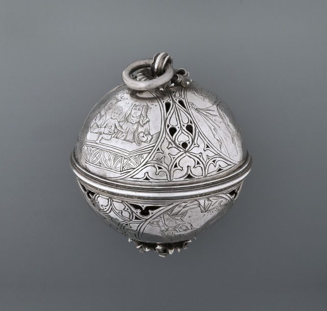 Abb. 5 Bisamapfel mit Heiligendarstellungen aus dem Schatz des Stiftes St. Dionysius zu Enger/Herford, Duftkapsel, Ende 15. Jahrhundert (Staatliche Museen zu Berlin, Kunstgewerbemuseum, 1888,641)
