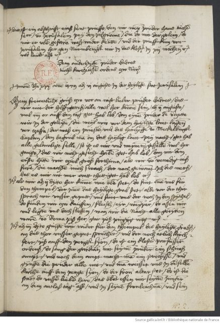 Abb. 6 Brief Hans Tuchers d. Ä. vom 6.8.1479 an seinen Bruder Endres Tucher in Nürnberg (Abschrift) (Paris, Bibliothèque nationale de France, Rés. 4° O2f. 13 (2), f. 1r.)