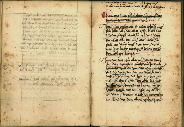 Abb. 4 Hans VI. Tucher, Reise in das Gelobte Land, Druckvorlage, um 1481/82, (Leihgabe der Tucher Kulturstiftung im Stadtarchiv Nürnberg, E29/III, 11, f. 86v–87r.)