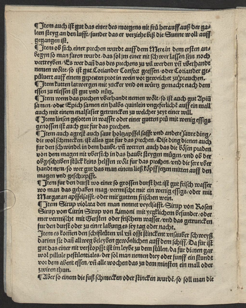 Die Anweisungen im Regimen Hermann Schedels für die Nürnberger Patrizier waren bewusst einfach gehalten und sollten von den Pilgern unterwegs ohne ärztliche Begleitung eigenständig umgesetzt werden. Die beigefügten Rezepte hingegen waren nicht für die Reisenden bestimmt, sondern dafür gedacht, in einer Apotheke in Venedig vorgelegt zu werden: Sie geben lediglich die benötigten Inhaltsstoffe in stark abgekürzter Form wieder und müssen für die Pilger weitgehend unverständlich gewesen sein. Im Folgenden werden die Anweisungen für das Verhalten auf See, wie sie in der Gesundheitslehre festgehalten sind, gebündelt dargestellt: Bezeichnend ist, dass das Regimen gleich zu Beginn betont, »dass ein yeder achtung auff sich selbs hab«.2 Gesundheit erscheint hier als individuelle Aufgabe mit kollektiver Wirkung. Die erste Gruppe der Anweisungen bezieht sich auf die Kontrolle der Ausscheidungen: »Wer auff dem mer offen pleibt vnd nit verstopfft wirt, der pleibt lang gesunt.«3 An Bord führten verdorbene Lebensmittel, schlechtes Wasser und unhygienische Zubereitung häufig zu schweren Magen-Darm-Erkrankungen. Diese mussten sorgfältig überwacht und behandelt werden. Formen der Ruhr, also infektiöse und epidemisch auftretende Durchfallerkrankungen, waren weit verbreitet und oftmals tödlich. Eine Seekrankheit zu Beginn der Fahrt wurde hingegen als unbedenklich angesehen. Gegen stärkere Symptome empfahl das Regimen, eine Stunde vor dem Essen Pestpillen (Pillulae imperiales) einzunehmen. Diese wurden in Nürnberger Apotheken erworben und auf der Reise mitgeführt. Die zweite Gruppe der Anweisungen richtet den Blick auf Speis und Trank: »Vnd manger wirt kranck und stirbt vmb der stinckenden speyß und trancks willen.«4 Geeignete Lebensmittel sollten in Venedig oder unterwegs auf den Mittelmeerinseln beschafft werden. Den Pilgern wurde empfohlen, reichlich Knoblauch, Zwiebeln und Salat mit Essig zu verzehren. Essig oder saure Säfte wie Apfel- oder Orangensaft sollten den Speisen zugesetzt werden, um Geschmack und Bekömmlichkeit zu verbessern. Bei allgemeiner Schwäche galt wie heute auch noch Hühnerbrühe als stärkend, damals jedoch angereichert mit Wein. Wasser sollte stets abgekocht werden. Die dritte Gruppe der Regelungen betrifft die Luft: »Item so jst gros aufmerckung zuhaben des luffts halben auff dem mere, wann der pos luft an alle mittel berurt das hercz des menschen, vnd jst zubesorgen, das es grosse kranckheyt pryngen mocht.«5