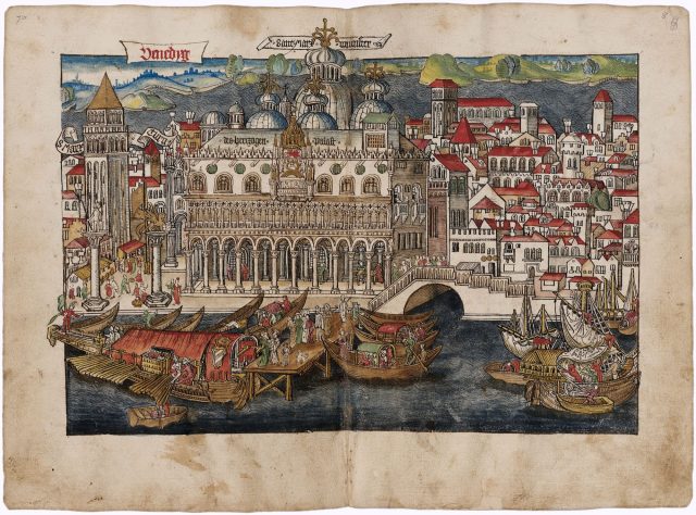 Nach dem Ritt über die Alpen kamen Tucher und Rieter im Frühjahr 1479 in Venedig an. Die Lagunenstadt war Knotenpunkt und Warteort für tausende europäische Durchreisende. Hier hatte sich eine Art Tourismusgewerbe mit Spezialisten für alle Bedürfnisse entwickelt. Die deutschen Gasthäuser oder der Fondaco dei Tedeschi als Handels- und Lagerhaus der deutschen Kaufleute boten auch den Pilgern eine Art Heimat in der Fremde. Die Reisenden schlossen sich zu Gesellschaften zusammen, erledigten letzte Vorbereitungen, vervollständigten ihre Reiseapotheken und suchten einen Patron für die Schiffsüberfahrt nach Jaffa. Diese patroni, meist Angehörige venezianischer Patrizierfamilien, vereinten die Rollen von Reeder und Kapitän. Sie waren verantwortlich für den Schutz und die Versorgung der Pilger sowie den Ablauf der Reise. Mit den Patronen schlossen die Pilger sogenannte Schiffsverträge ab, die ihre Verpflichtungen regelten und Verbindlichkeit zwischen Menschen unterschiedlicher Herkunft, Kulturen und Rechtsräume herstellten. In diesen Verträgen ging es auch immer wieder um den Umgang mit Krankheit und dem Tod auf dem Meer. Die Schiffe verließen Venedig im Frühjahr, machten Halt auf den Mittelmeerinseln und fuhren den Hafen von Jaffa an. Von dort ritten die Pilger auf Eseln gen Jerusalem.
